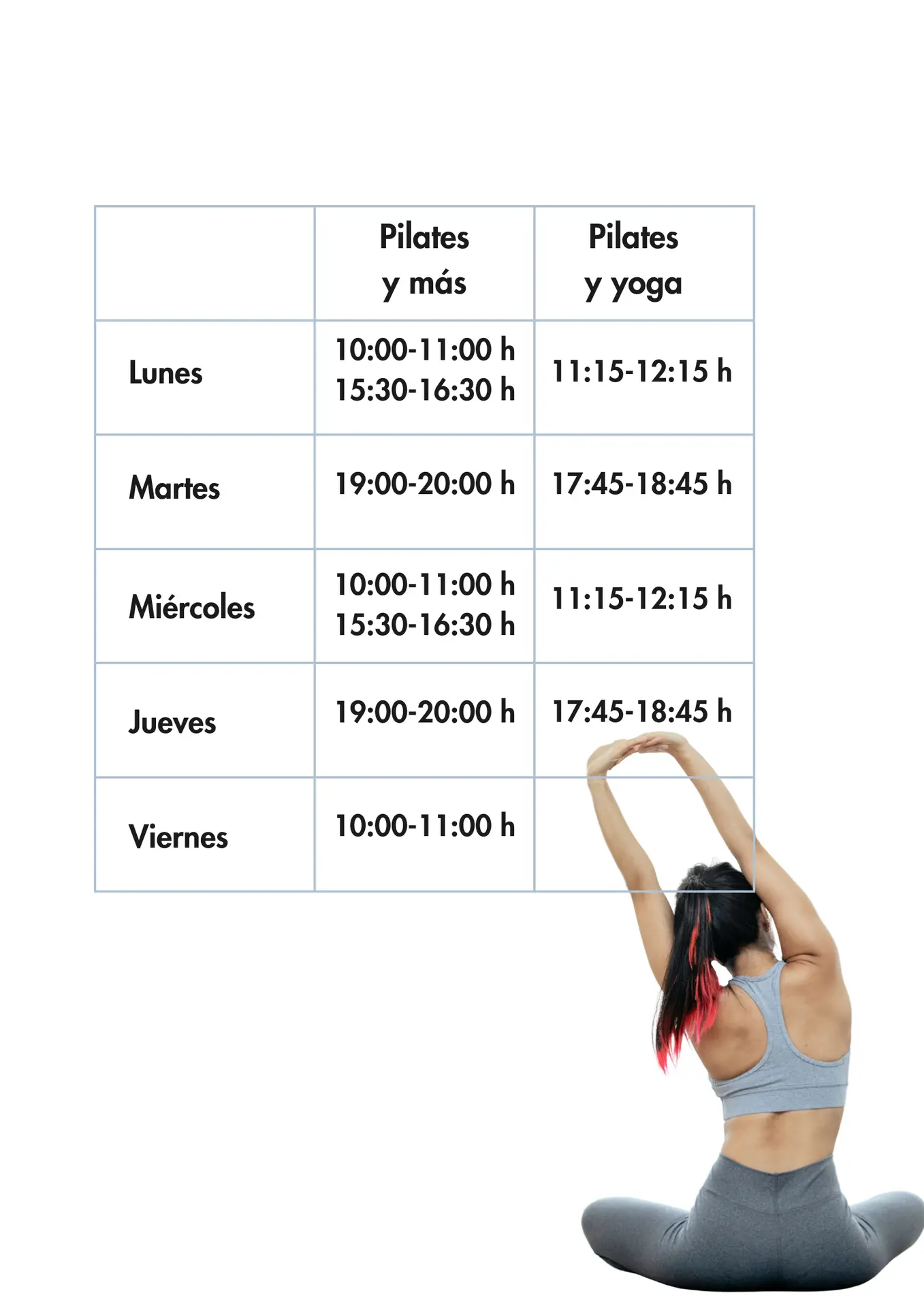 Elige el día y la hora que mejor se adapte a ti. Reserva uno o dos días a la semana en esos horarios y disfruta de ese tiempo para ti, que tanto te mereces. Son grupos cerrados en los que únicamente hay 10 plazas disponibles, para darte el mejor cuidado y crear vínculos entre el alumnado.